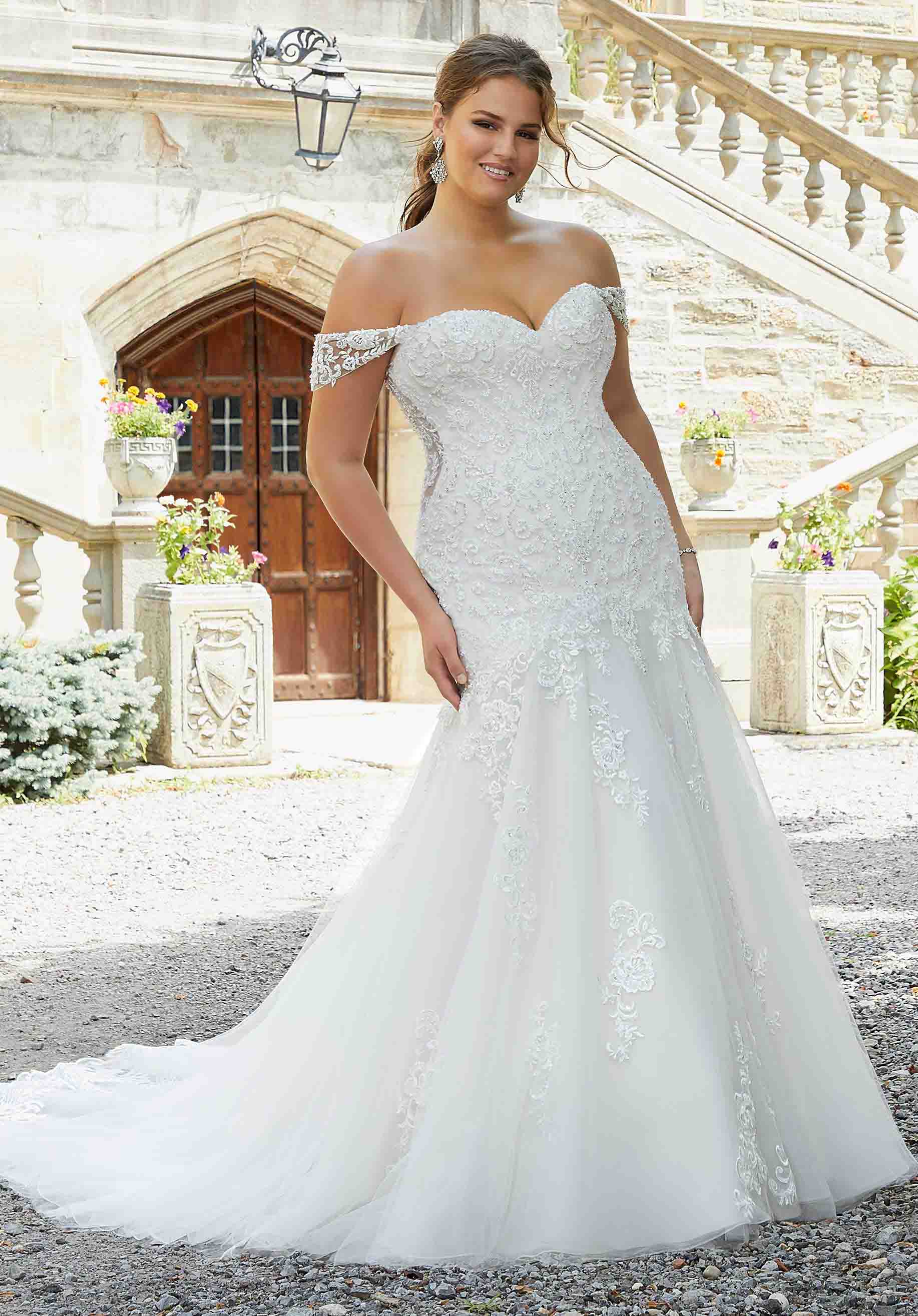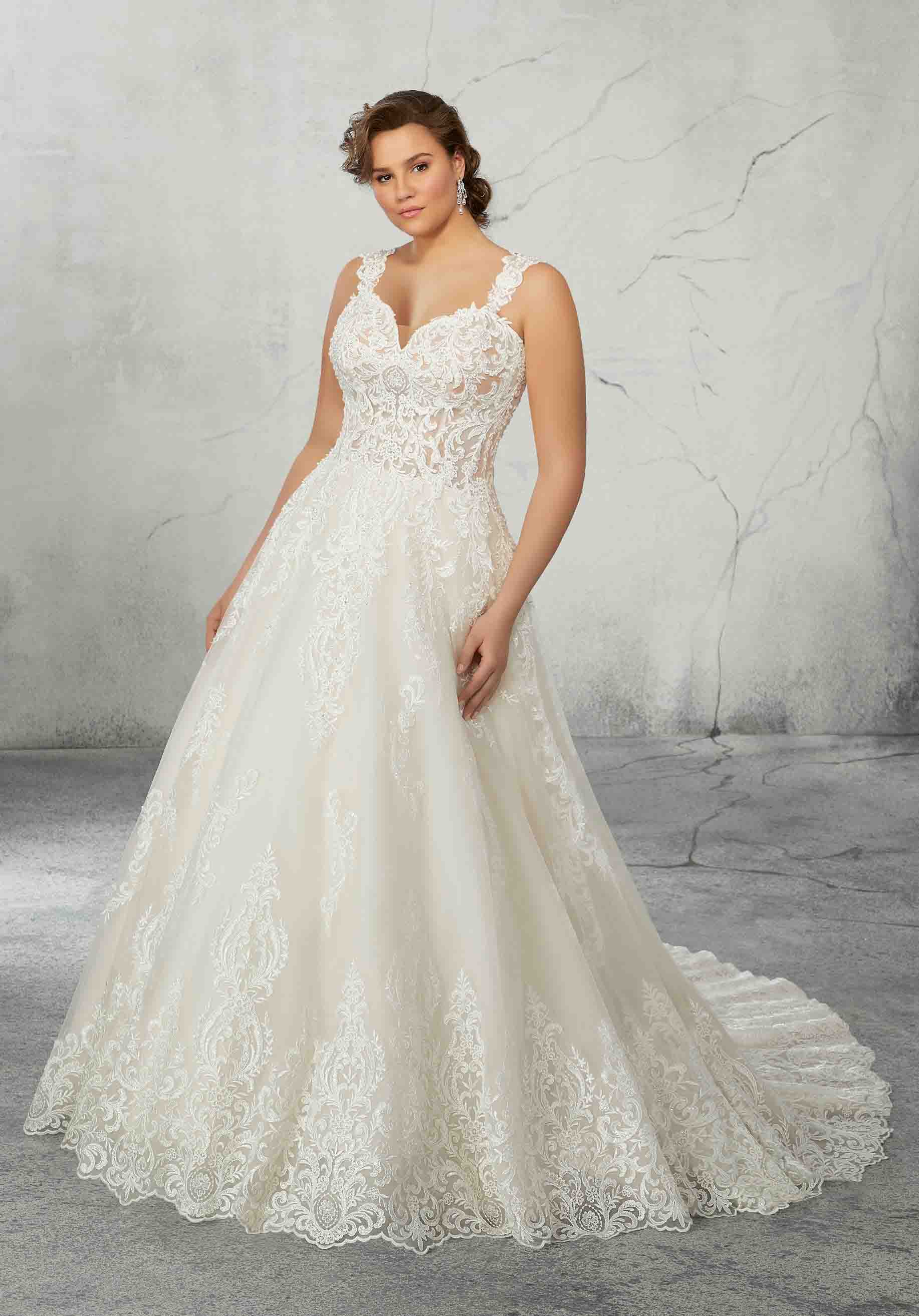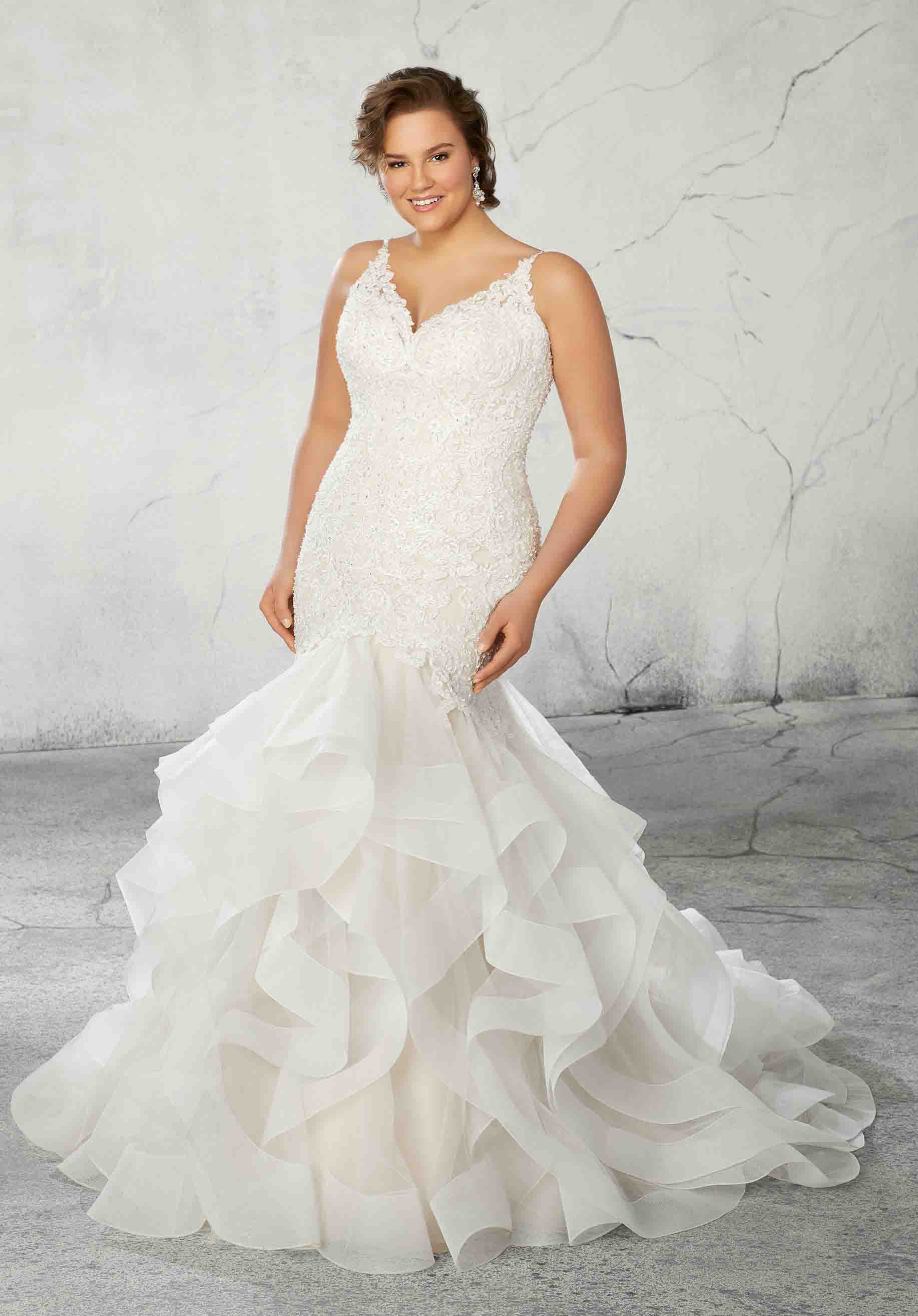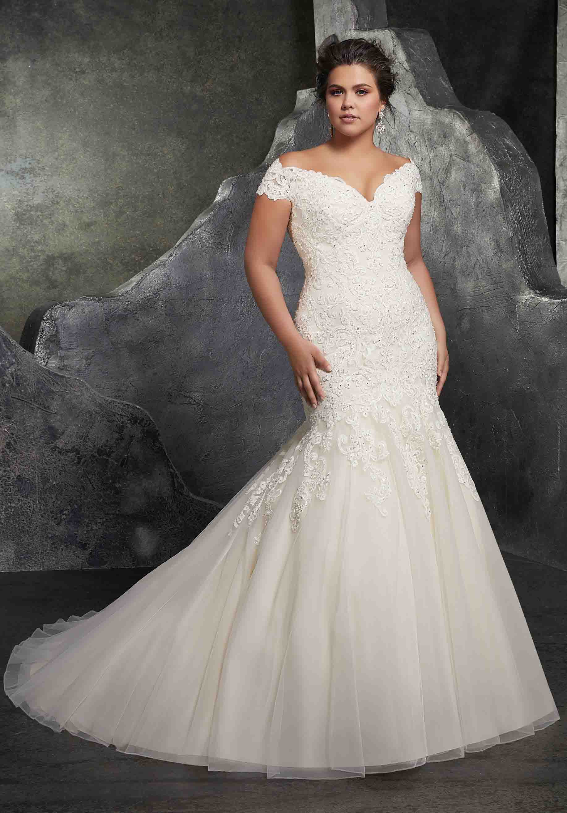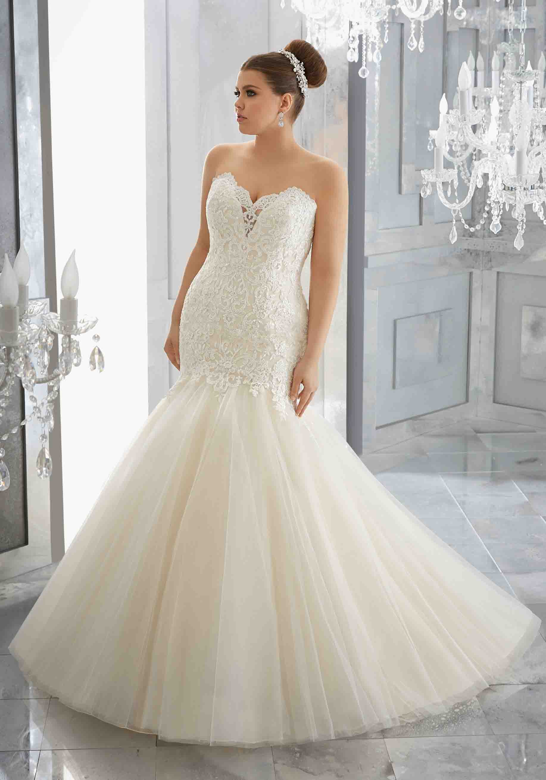 Abito da sposa in avorio dall’inconfondibile tonalità calda molto amata dalle spose. Il modello a sirena dal lungo corpetto completamente in pizzo con generosa scollatura impreziosita sia dalla velatura del pizzo all’incrocio del decolté’ in trasparenza, sia dal gioco delle applicazioni ne rende unico l’effetto. La gonna è una esplosione di tulle che scendendo dalla base del lungo corpetto, allargandosi a ruota intera magicamente fa sognare.